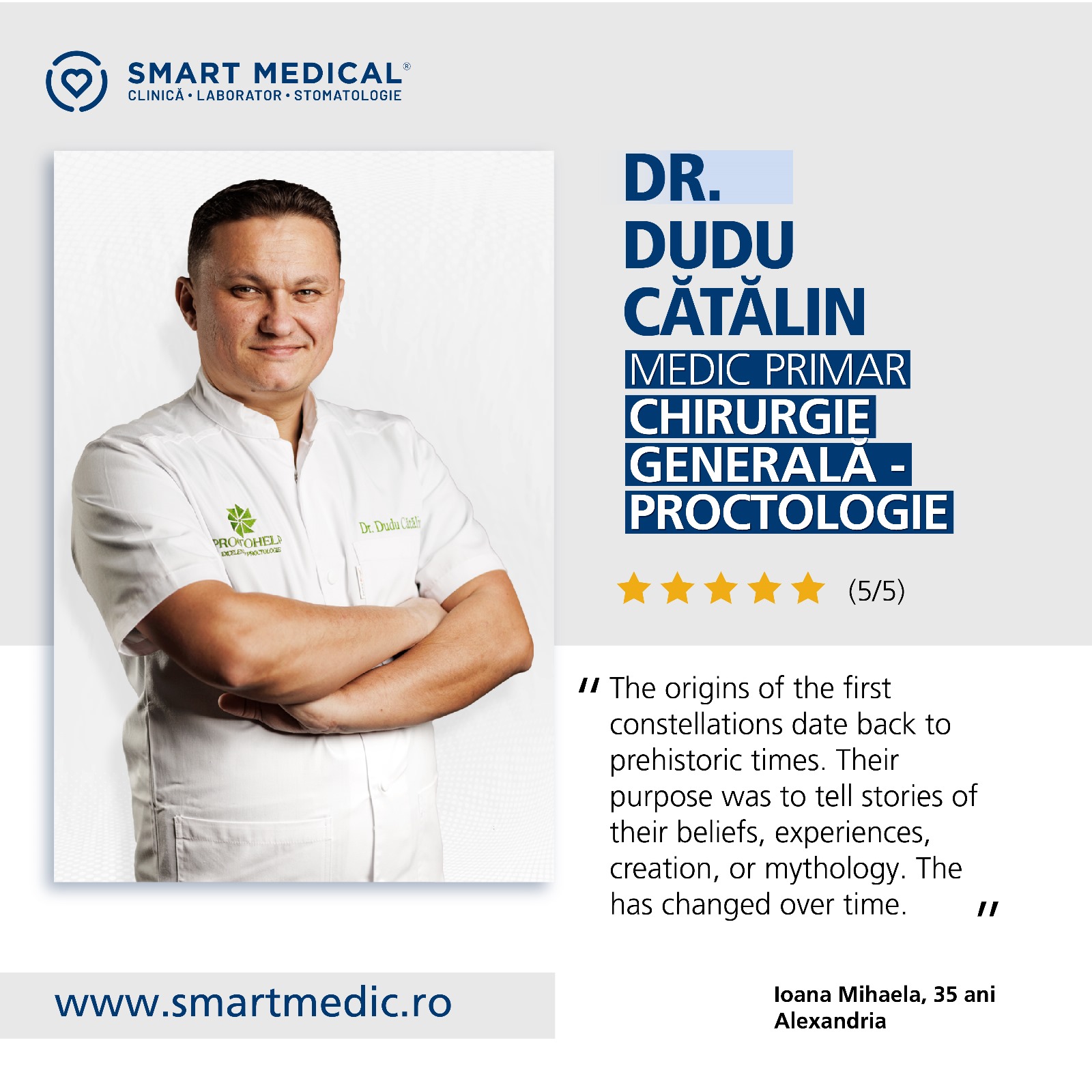 Dr. Dudu Cătălin, medic primar chirurgie generală, specializat în proctologie, este disponibil la Smart Medical, în clinicile din Alexandria și Roșiori, pentru consultații și investigații proctologice, inclusiv bandare hemoroidală și alte proceduri minim invazive.